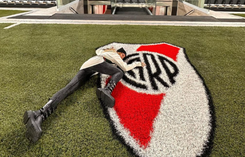 La actriz filmó varios videos para TikTok, acompañada y en soledad. A su vez, se fotografió sobre el delicado césped del Monumental.