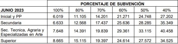 Así, para el caso de las escuelas primarias, el valor de la cuota será de 6.019 pesos para los establecimiento con 70% de subvención, mientras que escala a 27.202 pesos para los que reciben un 40%.