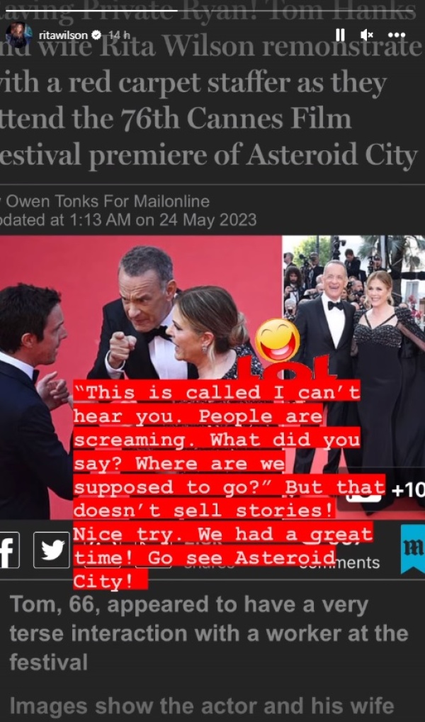 Rita subió a sus historias una captura de una nota titulada “¡Delirante soldado Ryan! Tom Hanks y su esposa Rita Wilson protestan con un empleado de la alfombra roja mientras asisten al estreno de Asteroid City en la 76ª edición del festival de cine de Cannes”, la cual utilizó para explicar que a diferencia de lo que ha circulado en redes, la pareja sólo estaba confundida por las indicaciones de hacia donde debían dirigirse después de las fotos en la alfombra roja.