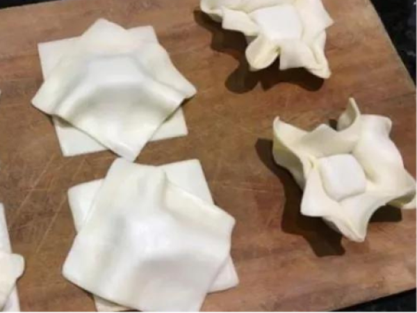 - Realizar un pliegue en todas sus esquinas hacia arriba, hasta lograr la forma que los caracteriza.