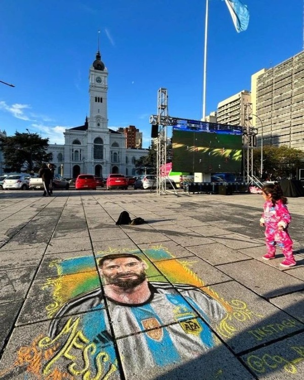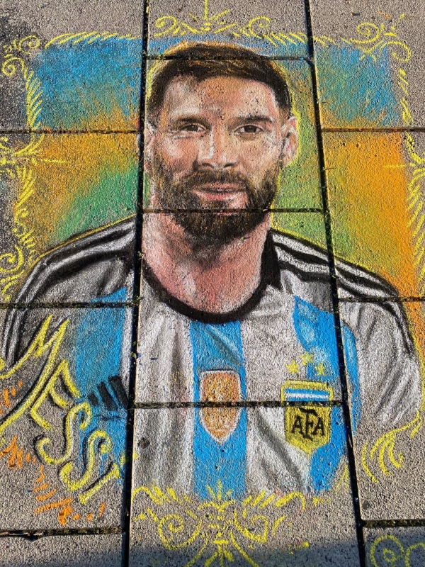 En el marco de una colorida celebración en la que abundaron la música, la gastronomía y los juegos para grandes y chicos, Claudio Pampillon dibujó en vivo al astro del fútbol sobre la vereda de la plaza, deslumbrando a miles de vecinos y turistas que se acercaron a disfrutar del Fan Fest.