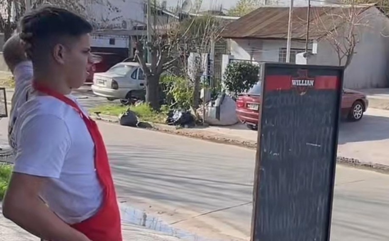 “La vida del que trabaja el sábado por la mañana”, tituló el clip, donde se lo puede ver cuando está a punto de colocar uno de los carteles que se posicionan en la vereda de las carnicerías para que los vecinos aprecien bien el precio de cada corte de carne. Acto seguido se ve cómo pasa un auto, con música de la aplicación, pero haciendo alusión de que en ese vehículo algunos jóvenes están volviendo del after.