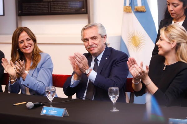 La ministra de Desarrollo Social de la Nación, Victoria Tolosa Paz, junto al presidente Alberto Fernández y la primera dama y presidenta honoraria de la Fundación Banco Nación, Fabiola Yáñez, encabezaron el acto de lanzamiento del programa Casa Amor, que estipula la creación de 24 espacios de contención social, sanitaria y educativa en todo el país.