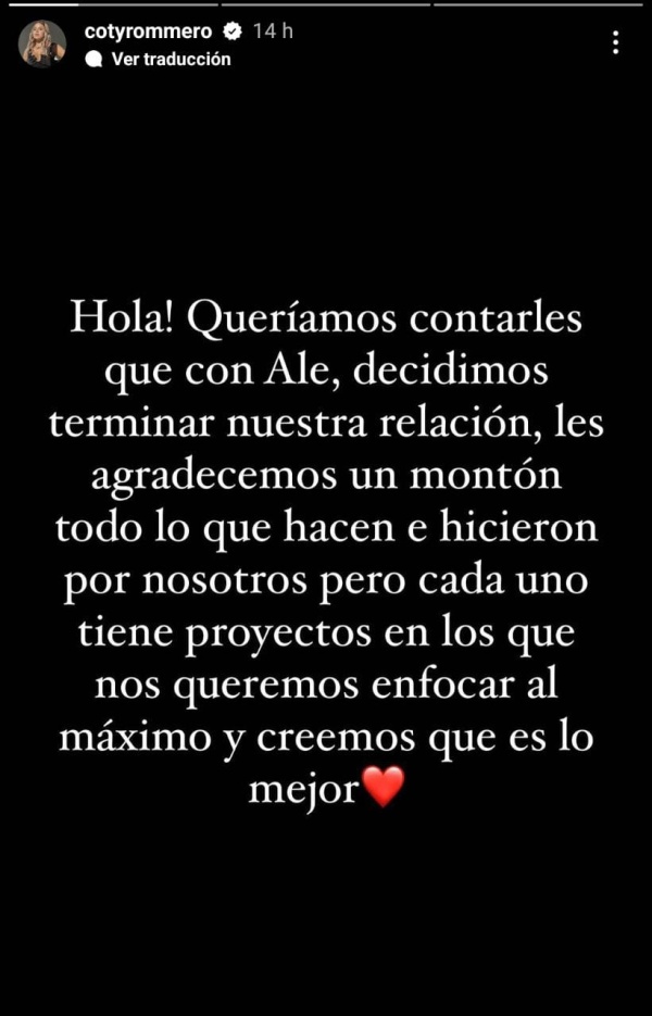 “Hola, queríamos contarles que con Ale, decidi mos terminar nuestra relación, les agradecemos un montón todo lo que hacen e hicieron por nosotros, pero cada uno tiene proyectos en los que nos queremos enfocar al máximo y creemos que es lo mejor”, comenzó escribiendo Constanza.