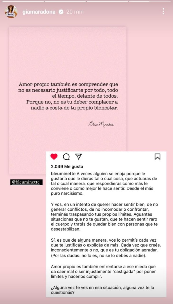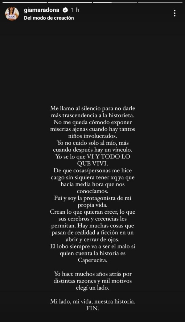 Es por eso, y luego de que se rumoreara fuerte por todos los medios, que esa indirecta iba dirigida a la hija del “Diez”, Gianinna utilizó sus redes sociales para declarar: “me llamo a silencio para no darle más trascendencia a la historieta. No me queda cómodo exponer miserias ajenas cuando hay tantos niños involucrados”.