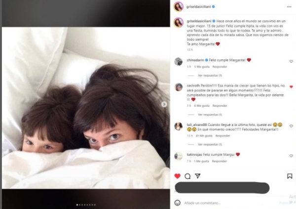 "La vida con vos es una fiesta, iluminás todo lo que te rodea. Te amo y te admiro, aprendo cada día de tu mirada sabia. Que nos sigamos riendo de todo siempre", continuó emotiva Siciliani y, para cerrar dicho post, finalizó expresándole lo mucho que la adora: "Te amo Margarita", sentenció.