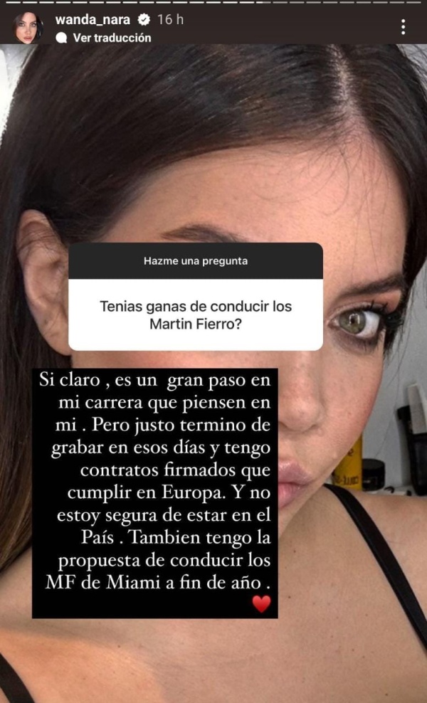 "Pero justo termino de grabar en esos días y tengo contratos firmados que cumplir en Europa. Y no estoy segura de estar en el país. También tengo la propuesta de conducir los Martín Fierro de Miami a fin de año”.