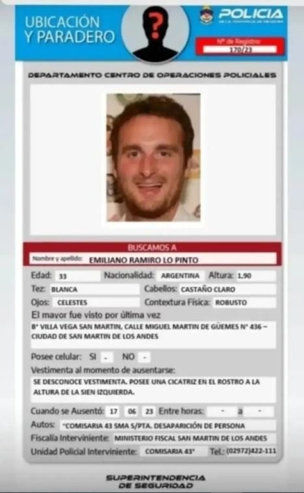 Un joven de 33 años, llamado Emiliano Ramiro y oriundo de San Martín de Los Andes, Neuquén, es intensamente buscado, luego de que se perdiera su rastro desde el domingo cuando habló por última vez con sus familiares.