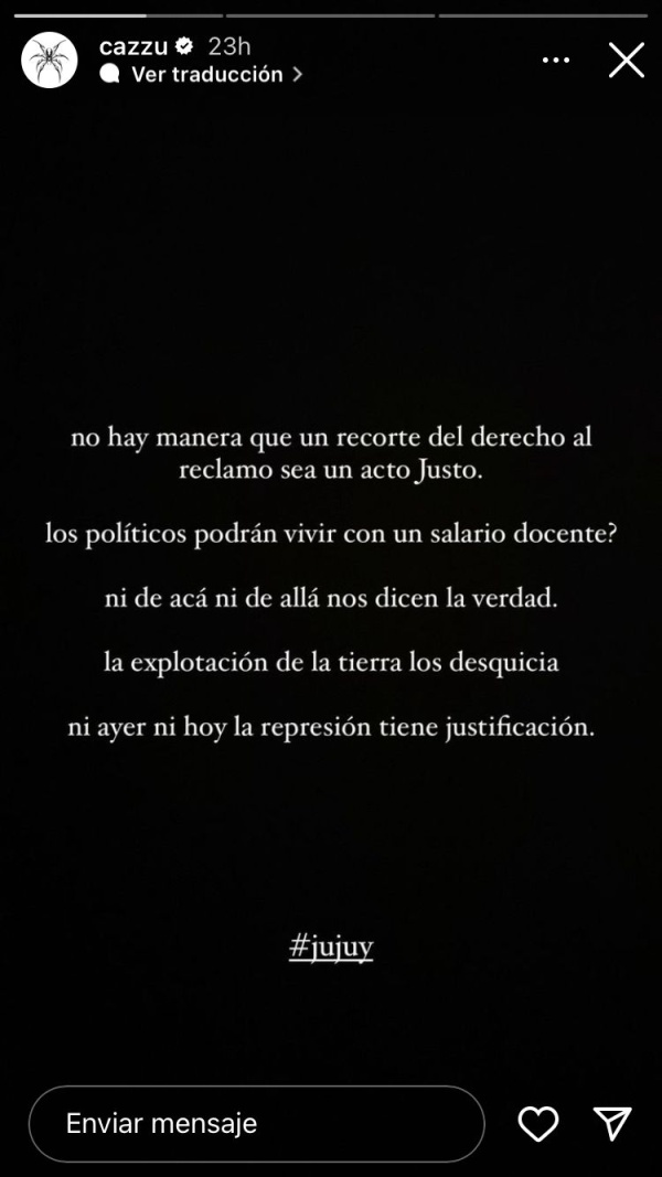 A través de su cuenta de Instagram, condenó la violencia estatal en Jujuy contra manifestantes, habló del salario docente y se refirió a la extracción de recursos naturales, otro de los reclamos del pueblo jujeño.