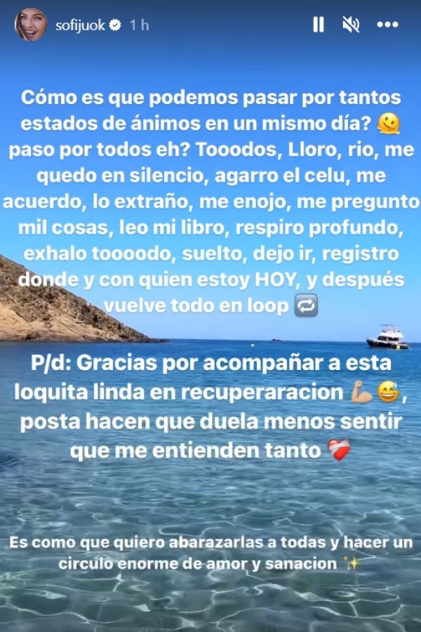 Horas más tarde, de esas risas pasó a publicar una reflexión mientras caminaba por la arena e ingresaba a las aguas españolas. “Como es que podemos pasar por tantos estados de ánimos en un mismo día. Paso por todos, eh. Todos. Lloro, rio, me quedo en silencio, agarro el celu, me acuerdo, lo extraño, me enojo, me pregunto mil cosas, leo mi libro, respiro profundo, exhalo todo, suelto, dejo ir, registro donde y con quien estoy hoy, y después vuelve todo en loop”.