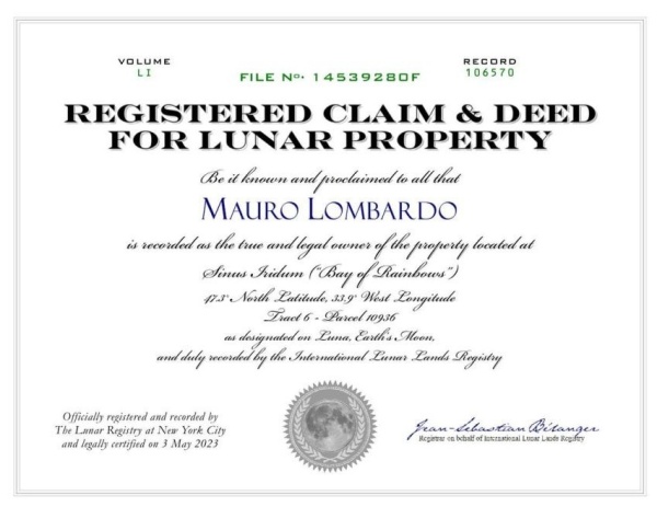 También se suma en el certificado: "Registrado y registrado oficialmente por The Lunar Registry en la ciudad de Nueva York y certificado legalmente el 3 de mayo de 2023 Jean-Sebastian Bitanger Registrador en nombre del Registro Internacional de Tierras Lunares".