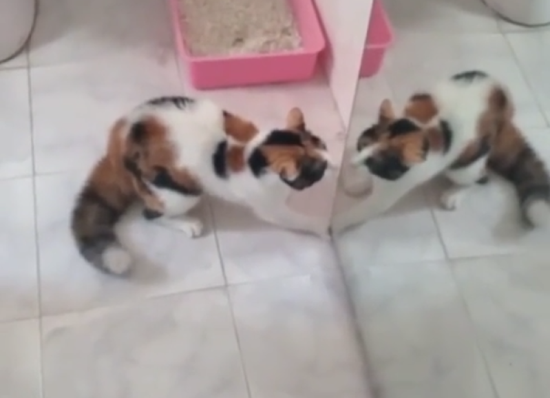 El hombre que graba ingresa al baño diciendo: “Sos vos pava”. Es en ese momento cuando aparece su gata.