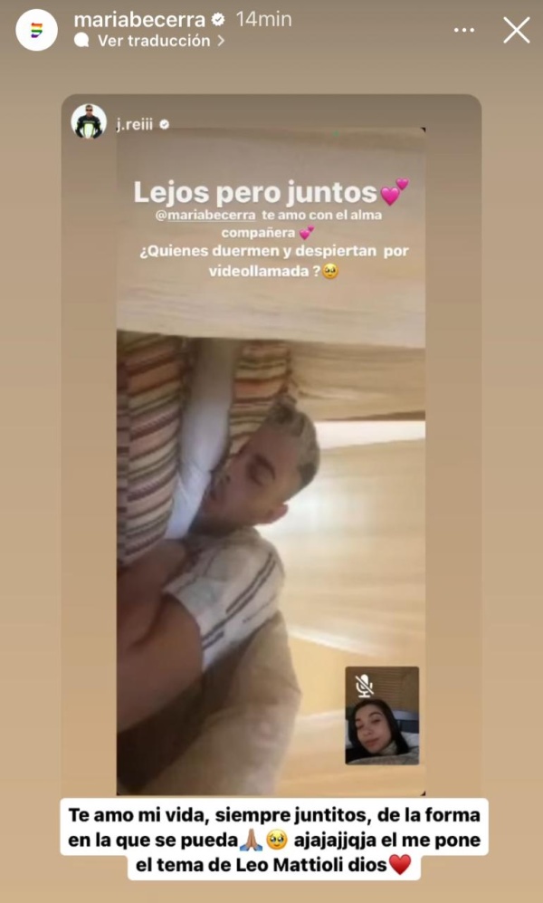 En este contexto, la artista argentina compartió una historia que subió a Instagram su pareja, J Rei, en la que él se encuentra durmiendo por videollamada y, del otro lado del celular, está María observando como duerme.