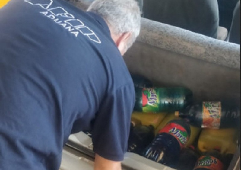Personal de la Dirección General de Aduanas evitó el contrabando de más de 300 litros de combustible que un ciudadano de Paraguay intentaba llevar a cabo al transportar la mercadería en botellas de gaseosas, aceite y bidones plásticos en su automóvil.