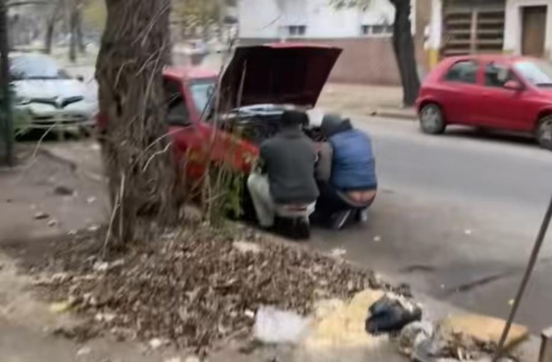 “Está flama el auto boludo, lástima el rayón”, se escucha que menciona el chico mientras va caminando con amigos. ¿Pero por qué hizo ese comentario? Resulta que vio a dos hombres reparando la parte delantera de un auto, pero al ponerse en cuclillas se les ve parte del trasero.