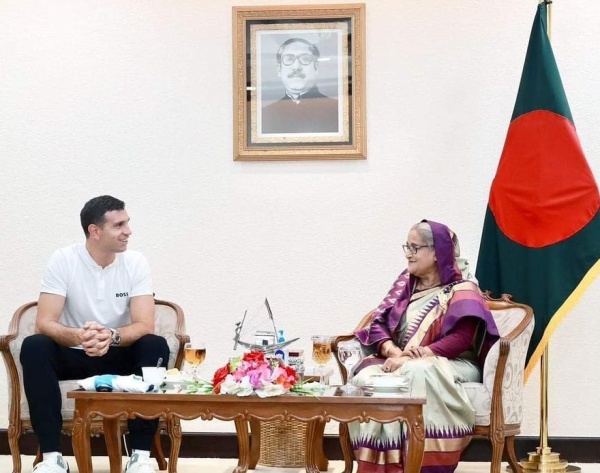 Emiliano 'Dibu' Martínez con la primera ministra de Bangladesh, Sheikh Hasina, en su visita por el país asiático.