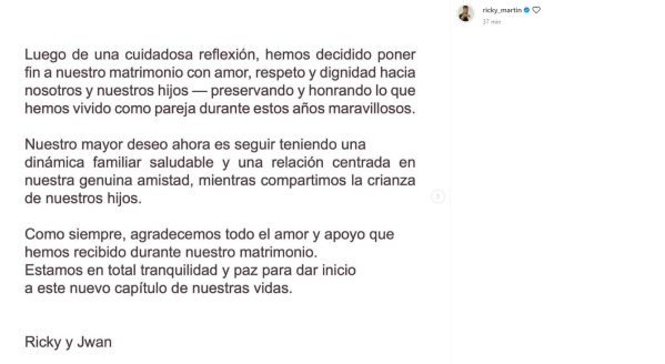 “Luego de una cuidadosa reflexión, hemos decidido poner fin a nuestro matrimonio con amor, respeto y dignidad hacia nosotros y nuestro hijos, preservando y honrando lo que hemos vivido como pareja durante estos años maravillosos”, comenzó contando Ricky.