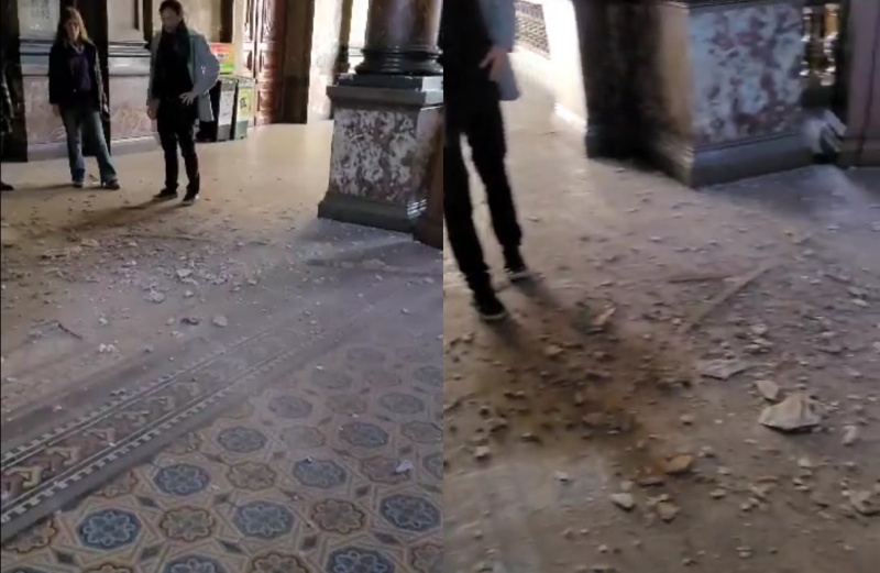 En el video e imágenes que compartió podía verde un desprendimiento en el techo del edificio y los materiales que había quedado desparramados en el suelo.