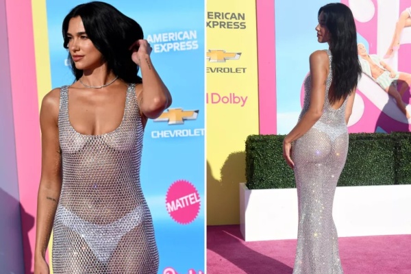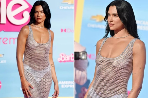 Aunque Margot Robbie viene robándose el protagónico con sus looks inspirados en la muñeca, en la premiere del domingo en Los Ángeles, Dua Lipa se llevó todas las miradas con un osado vestido totalmente transparente.