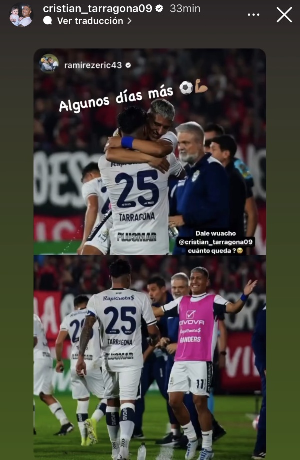 Rápidamente el ex delantero de Vélez y Patronato le respondió con una imagen de ambos y escribió: "Algunos días más". La publicación despertó todo tipo de conjeturas y especulaciones entre los hinchas albiazules teniendo en cuenta que Tarragona es pretendido por varios clubes entre los cuales se encuentra Independiente y desde Avellaneda aseguran que ya hay un acuerdo total con el jugador de Gimnasia que ahora solo debería comunicarle a la dirigencia de Mariano Cowen que hará uso de la claúsula de rescisión que tiene a su favor para continuar, mediante el pago previo de 250 mil dólares, su carrera en el equipo de Ricardo Zielinski.