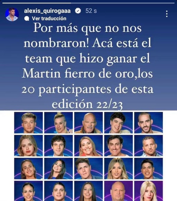 En ese sentido, asistieron a la famosa cena Marcos Ginocchio, Julieta Poggio, Daniela Celis, Lucía Villar, Alfa y Nacho Castañares. Por ese motivo, Alexis Quiroga manifestó: “por más que no nos nombraron, acá está el team que hizo ganar el Martin Fierro de Oro. Los 20 participantes de esta edición 22/23”.
