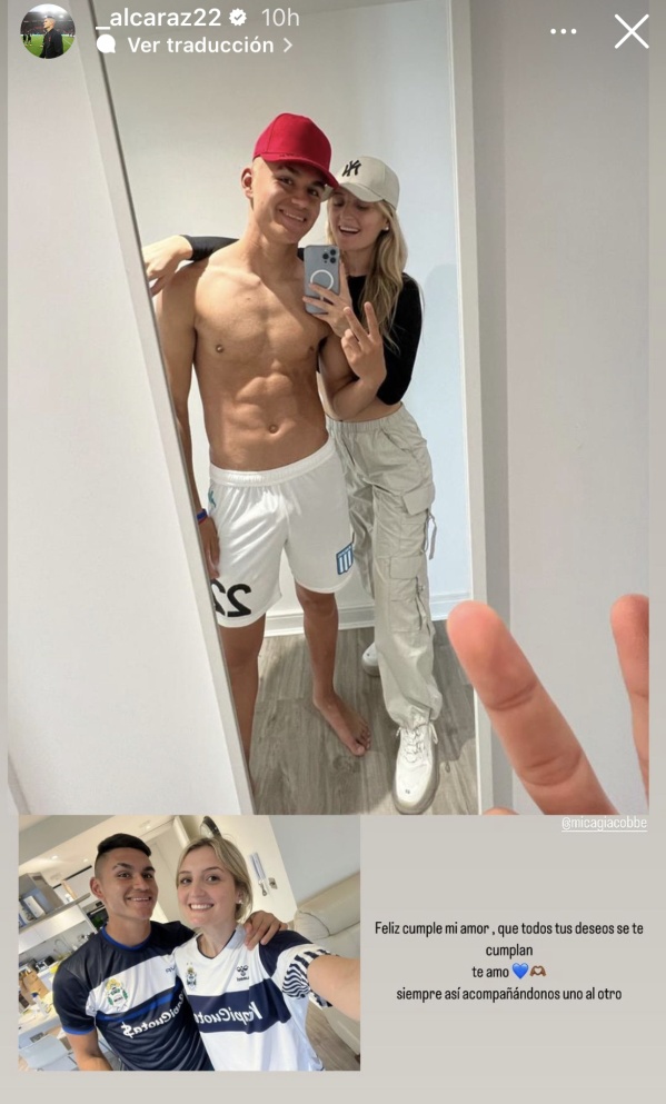 Ahora el ex futbolista de Racing, que fue vendido en trece millones de euros y que insólitamente no quedó en el Lobo, revolucionó a todos los hinchas triperos ya que saludó a su novia (micagiacobbe) por el cumpleaños a través de instagram y agregó una foto donde se los ve a ambos con la camiseta de Gimnasia la cual le obsequiaron el día que lo agasajaron en 60 y 118.