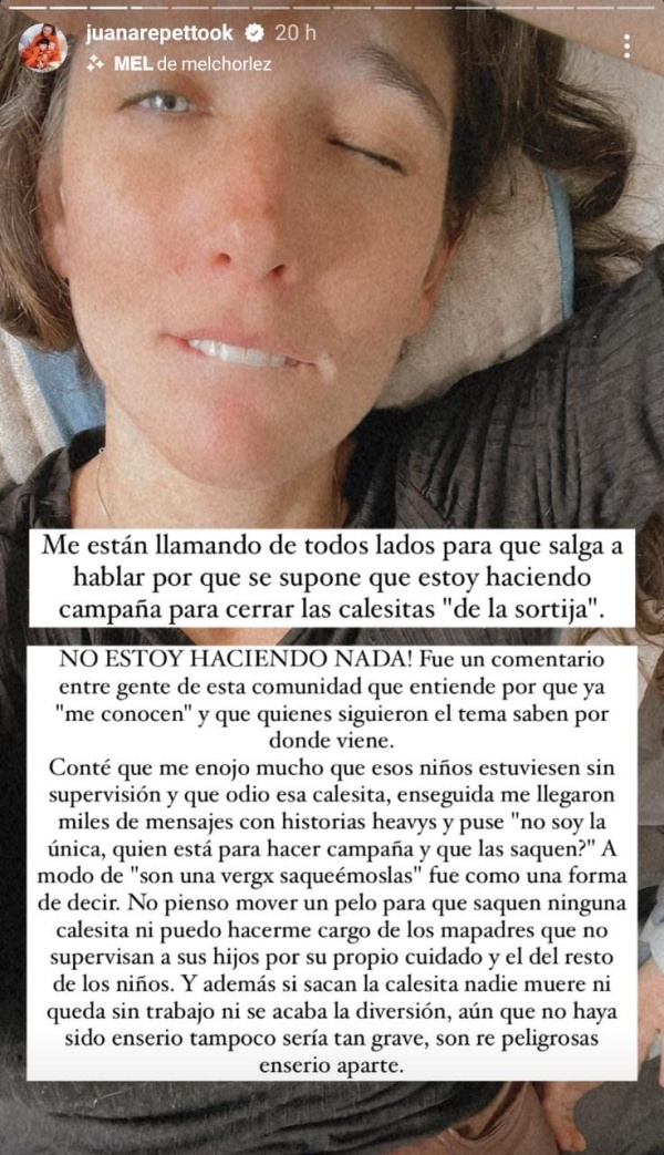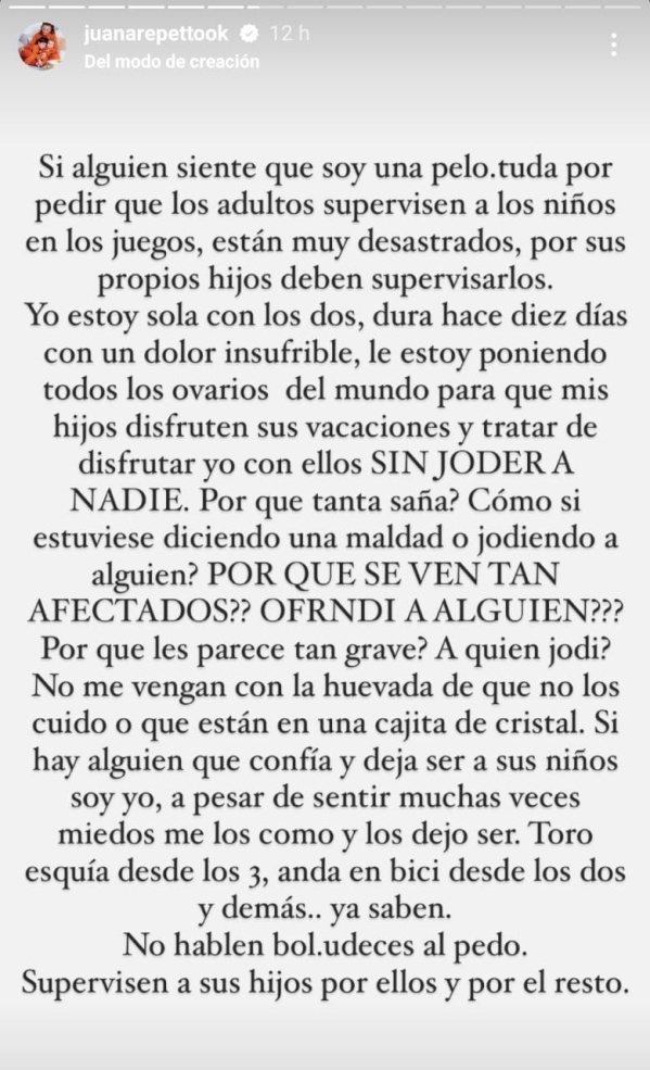 Y apuntó: “Si alguien siente que soy una pelotuda por pedir que los adultos supervisen a los niños en los juegos, están desastrados, por sus propios hijos deben supervisarlos. Yo estoy sola con los dos, dura hace diez días con un dolor insufrible, le estoy poniendo todos los ovarios del mundo para que mis hijos disfruten sus vacaciones y tratar de disfrutar yo con ellos”.
