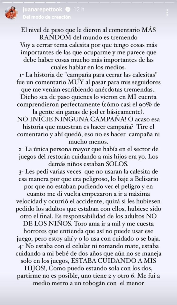 Luego de que Juana Repetto hiciera un descargo público en sus redes sociales sobre la idea de prohibir un tipo de juego en las plazas, ya que su hijo mayor Toribio se había lastimado en una, nuevamente la actriz salió a manifestarse.