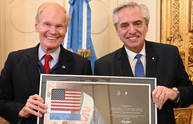 El presidente Alberto Fernández se reunió en el Salón Eva Perón de Casa Rosada al administrador de la NASA, Bill Nelson, para profundizar la actividad espacial pacífica conjunta entre ambos países y oficializar la adhesión de la Argentina a los Acuerdos Artemisa.