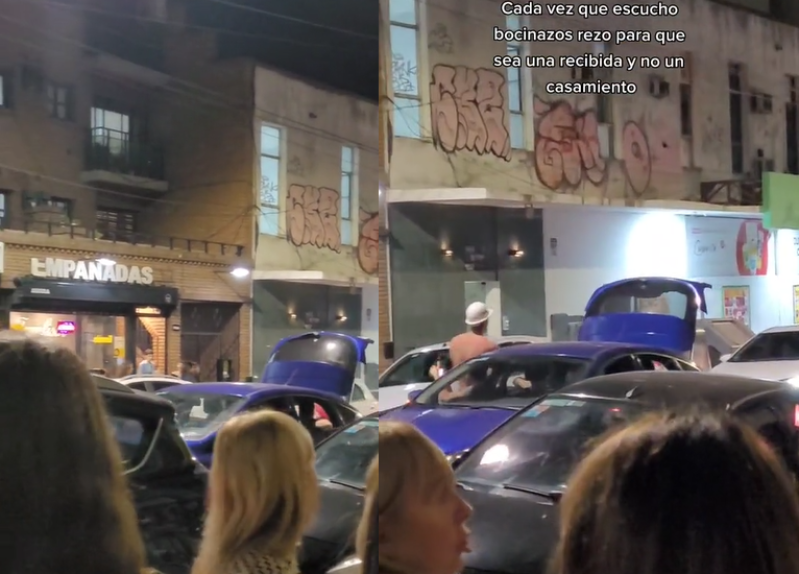 La usuaria señala que cada vez que escucha bocinazos “reza” para que sea una recibida y no un casamiento. Algo tradicional que sucede en las principales ciudades de Argentina, es el hecho de festejar la recibida de un ser querido, con una gran caravana de autos que implican, música a volumen alto, gritos por parte de quien se recibe, sus amigos y familiares y una lluvia de bocinazos por doquier.