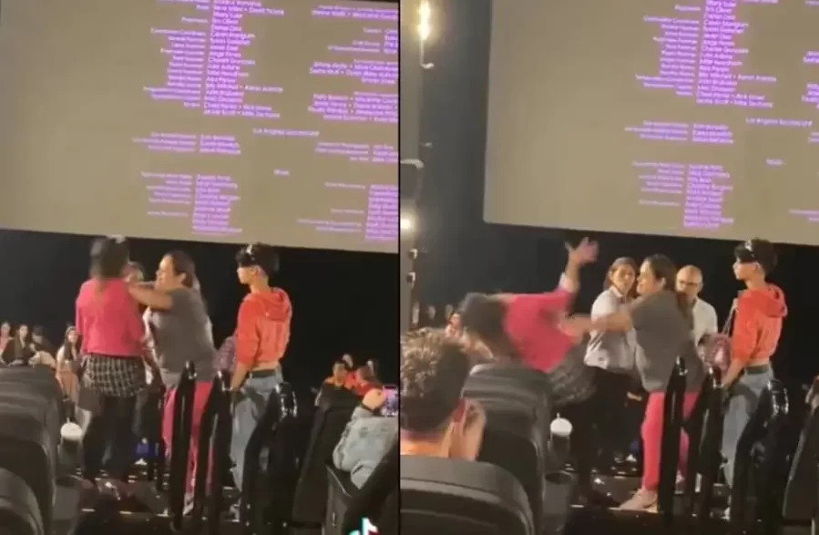 Según las imágenes, todo comenzó cuando una muchacha le gritó desde las escaleras a otra. Si bien parecía que iba a hacer oídos sordos, de un momento a otro se levantó y se plantó cara a cara. Acto seguido, la otra mujer le pegó un empujón lo suficientemente fuerte para que caiga de espalda contra las butacas del cine. La víctima se levantó rápido e intentó responder, pero en fueron separadas por el público.