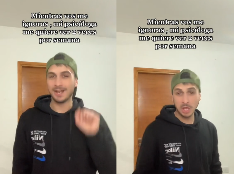 “Mientras vos me ignoras, mi psicóloga me quiere ver 2 veces por semana” relata el joven influencer. Haciendo alusión a la falta de cariñó y presencia por parte de su novia y la comunicación fluida que encuentra cuando se sienta frente al diván de su psicóloga (en el cual seguramente, manifiesta el problema que tiene con su pareja).