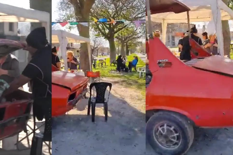 Con lo que quedó de su vehículo, el hombre armó una parrilla y montó un negocio llamado “El Parrillero del 12”, en referencia al modelo del coche, Renault 12 rojo.