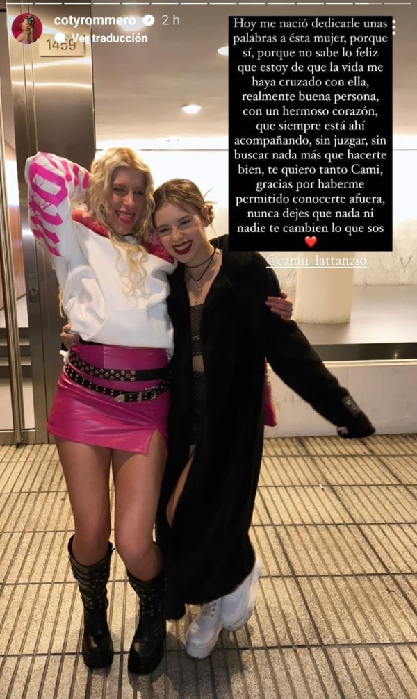 Luego de disfrutar un noche con amigos y al ser las únicas mujeres que se juntaron del grupo, Coti Romero decidió dedicarle un posteo tiempo después a Camila sobre la alegría que le genera compartir momentos de su vida con ella.