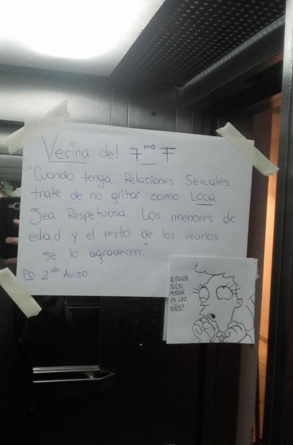 “Vecina del séptimo ´F¨, cuando tenga relaciones sexuales trate de no gritar como loca. Sea respetuosa, los menores de edad y el resto de los vecinos se lo agradecen”, PD segundo aviso”, se lee en el cartel. Luego alguien le sumó el dibujo de Helena Alegría, personaje de Los Simpsons con la frase icónica: “¿Alguien puede pensar en los niños?”.