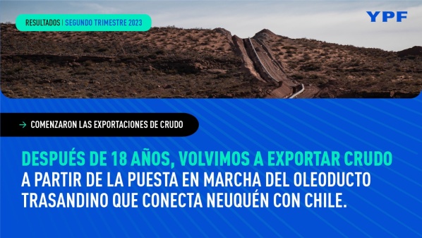 "Después de 18 años, YPF volvió a exportar crudo neuquino de forma estructural a partir de la rehabilitación, en mayo pasado, del oleoducto trasandino que conecta Neuquén con Chile", resaltó la compañía.