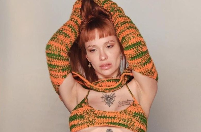 Con una pollera, corpiño y mangas tejidas a crochet en tonos naranja y verde, la cantante posó muy sensual y hasta bailó, luciendo su increíble figura, además de todos los tatuajes que distinguen a la artista.