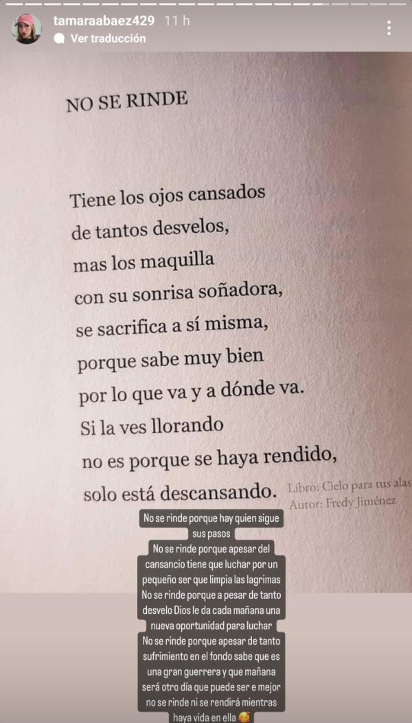 Y Tamara sumó: “No se rinde porque hay quién sigue sus pasos. No se rinde porque a pesar del cansancio tiene que luchar por un pequeño ser que limpia las lágrimas. No se rinde, porque a pesar de tanto desvelo, Dios le da cada mañana una nueva oportunidad para luchar”.
