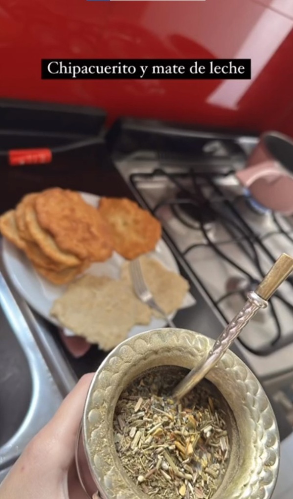 La correntina usó un tema de chamamé para mostrar su merienda y detallo que iba a degustar de unos ricos chipa cueritos y un mate de leche. Esto último asombró a todos: “Soy uruguayo, mate de leche nooooo... Coti no te lo perdono”, le escribió un seguidor y la rubia abrió el debate.