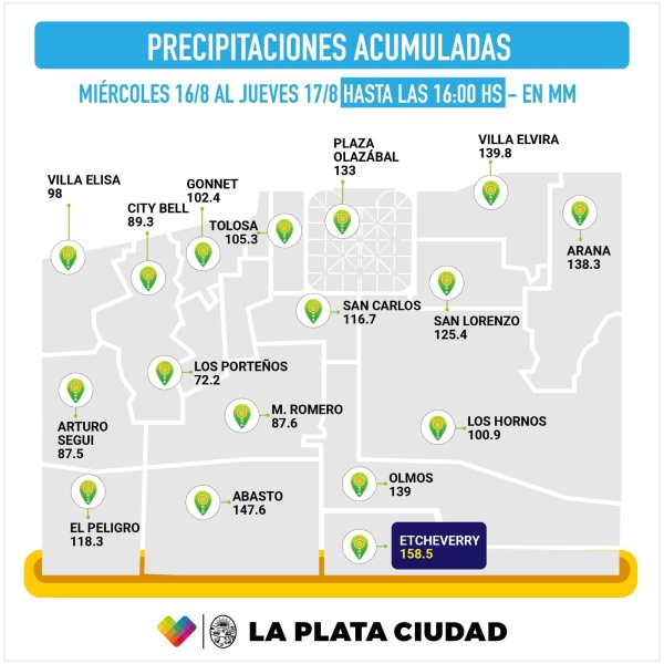 Desde la Municipalidad de La Plata difundieron un mapa que detalla cuánto llovió en cada barrio, el cual ubica a la localidad de Etcheverry como la localidad más afectada.