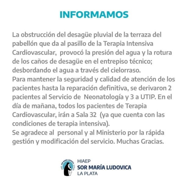 "La obstrucción del desagüe pluvial de la terraza del pabellón que da al pasillo de la terapia intensiva cardiovascular provocó la presión del agua y la rotura de los caños de desagüe en el entrepiso técnico, desbordando el agua a través del cielorraso", dice un comunicado emitido por la institución.
