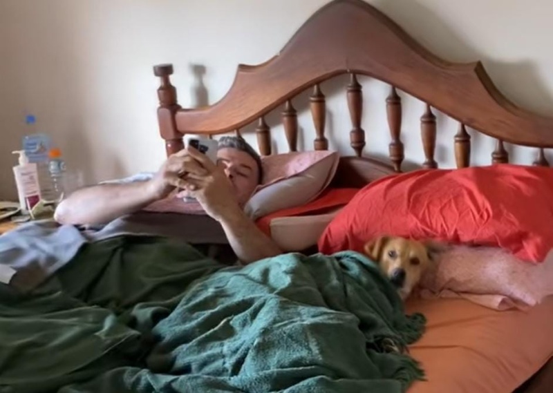 Resulta que de un momento a otro entró repentinamente a la pieza de quien es su papá, y lo encontró cómodamente recostado junto al perro de la familia tapado y descansando como un bebé, mientras su progenitor se encuentra relajado con el celular en mano.