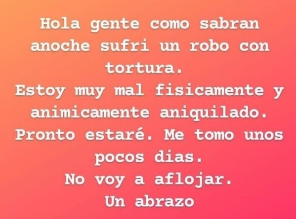 "Hola gente, como sabrán, anoche sufrí un robo con tortura. Estoy muy mal físicamente y anímicamente aniquilado", comenzó diciendo en su cuenta de Instagram.