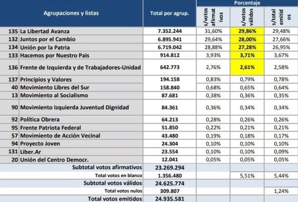 Y Unión por la Patria, la coalición oficialista que tiene a Sergio Massa como aspirante al sillón de Rivadavia, sumó 27,28 por ciento (6.719.042 votos).
