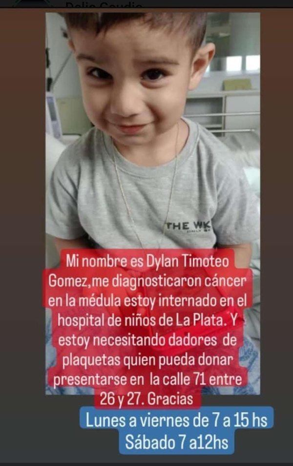 Una nueva campaña de donación circula por las redes sociales en La Plata: la familia de Dylan Timoteo Gómez, un nene que le diagnosticaron cáncer de médula, busca personas solidarias que puedan donar plaquetas.