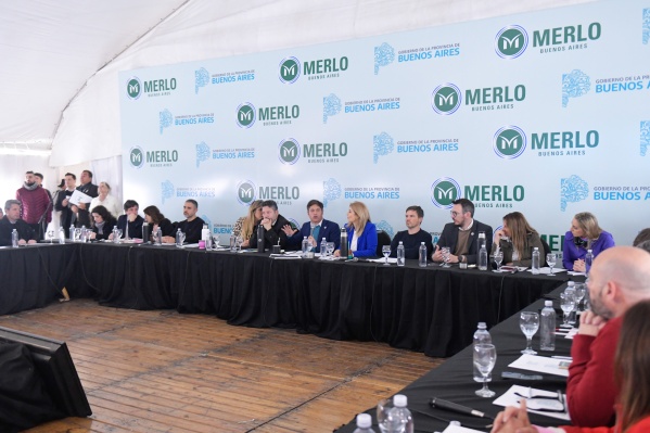 El gobernador Axel Kicillof encabezó este lunes una reunión con empresarios bonaerenses y representantes del sector productivo de toda la provincia, en el marco de la 5º Expo de la Industria y la Producción “Hecho en Merlo”. Fue en la Quinta La Colonial del Parque Municipal Néstor Kirchner, junto a la vicegobernadora Verónica Magario; el ministro de Producción, Ciencia e Innovación Tecnológica, Augusto Costa, y el presidente del Grupo Provincia, Gustavo Menéndez.