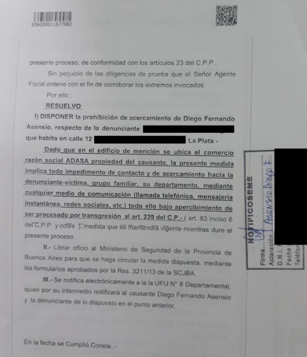 Y agrega: “Dado que en el edificio de mención se ubica el comercio razón social ADASA, propiedad del causante, la presente medida implica todo impedimento de contacto y de acercamiento hacia la denunciante-víctima, grupo familiar, su departamento, mediante cualquier medio de comunicación (llamada telefónica, mensajería instantánea, redes sociales, etcétera), todo ello bajo apercibimiento de ser procesado por transgresión al artículo 239 del Código Penal, medida que se mantendrá vigente mientras dure el presente proceso”.??Según pudo saber este medio, luego de que Diego Asensio fuera notificado, tuvo tres llamados de atención por desobediencias, por llevar adelante distintos tipos de hostigamiento hacia las víctimas y su unidad funcional.