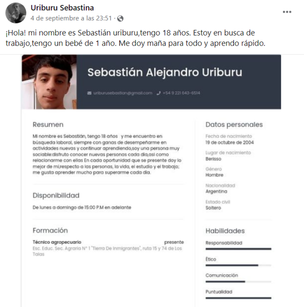 “Siempre con ganas de desempeñarme en actividades nuevas y continuar aprendiendo, soy una persona sociable, disfruto de conocer nuevas personas cada día. En cada oportunidad que se me presenta doy lo mejor de mí, me gusta aprender mucho para superarme día a día”, se describe el joven en el currículum que armó.