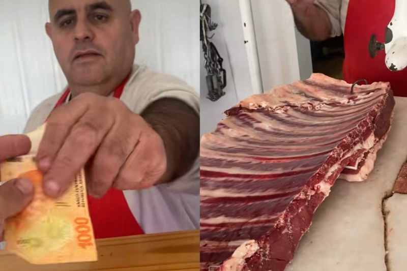 “Hola buen día, ¿Pueden ser 1000 pesos de asado?”, se escucha que le dice @valenchuu017 en un video que subió a su cuenta de Tik Tok, donde se puede ver que el carnicero agarra el dinero, va a una heladera, saca un enorme costillar, y para su asombro solo procede a sacarle una foto y mencionarle que se la va a enviar, ya que apenas le alcanzó para eso.