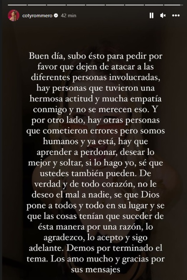 Y siguió: “De verdad y de todo corazón, no le deseo el mal a nadie, sé que Dios pone a todos y todo en su lugar y sé que las cosas tenían que suceder de esta manera por una razón, lo agradezco, lo acepto y sigo adelante. Demos por terminado el tema. Los amo mucho y gracias por sus mensajes”.
